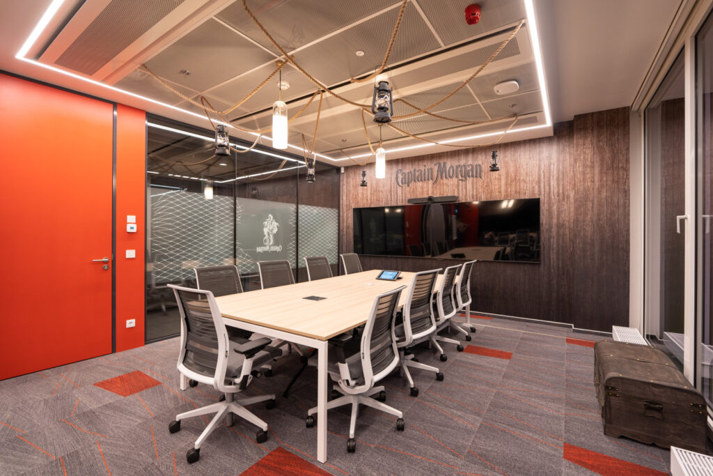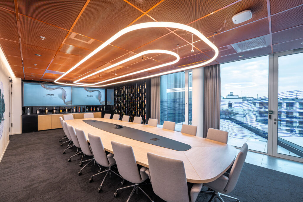 Örömünkre szolgál hogy egyre több iroda kialakítás, melyben az általunk kizárólagosan forgalmazott fém álmennyezetek, fa burkolatok, vagy most már akár a szövet álmennyezetek, kaptak helyt, akár az év irodája címre jogosult is lehet. Ilyen irodatér a most bemutatni szándékozott a Diageo által még 2021-ben kialakított belső terei, melyhez többféle fém álmennyezet rendszert szállítottunk, köztük az Aspen által gyártott Integra Hook-on és Hook-on Corridor expandált lemez álmennyezetet.