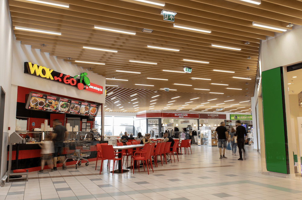 Korábban is szállítottunk fém álmennyezeteket a Tesco áruházakba országosan, de a mostani rendhagyóra sikeredett, mert az összes közösségi terekben a mi általunk biztosított Baffle sávos fém álmennyezet került, méghozzá fa imitált felülettel. A tárgyi mennyezet Székesfehérváron kapott helyt, az Aszalvölgyi úti Tesco Hipermarket áruházban.