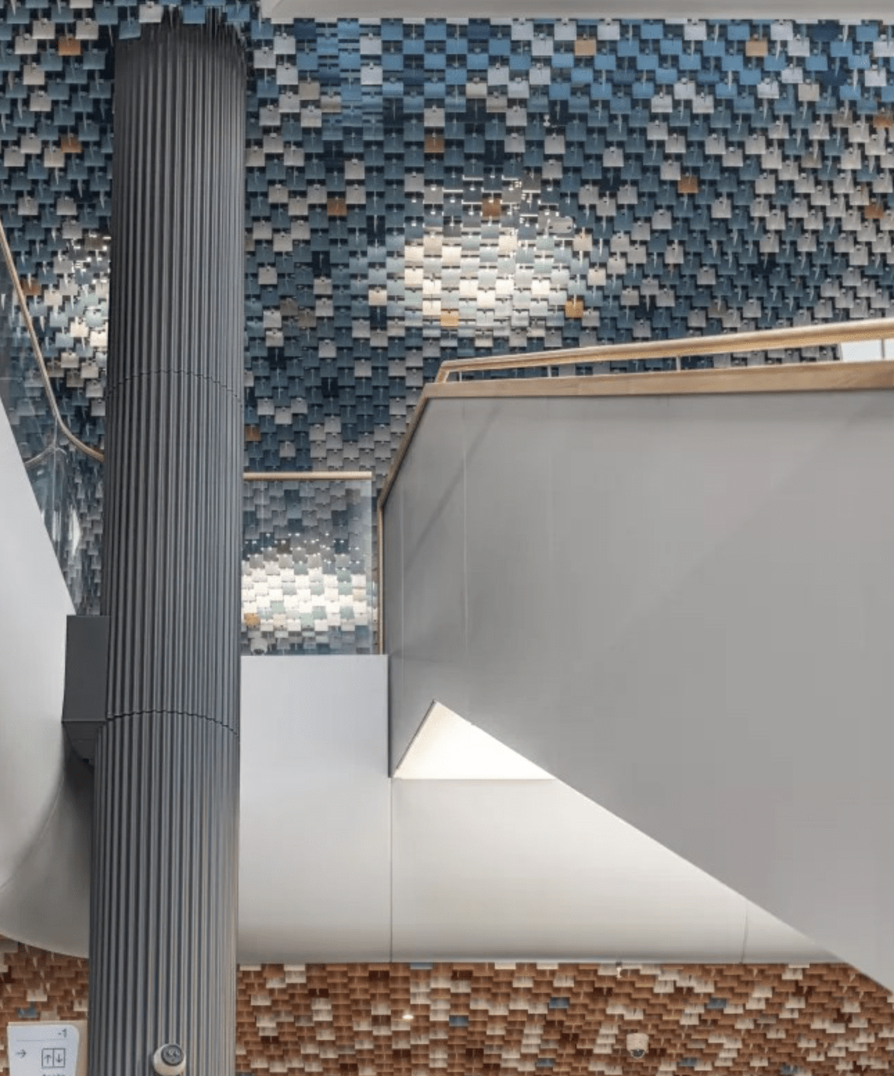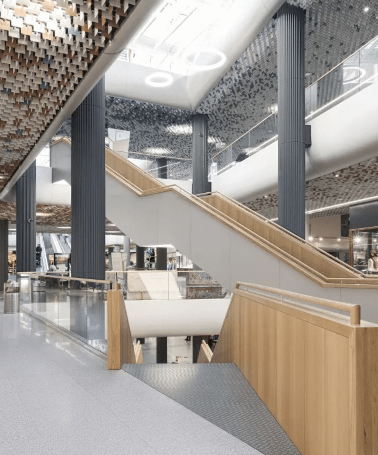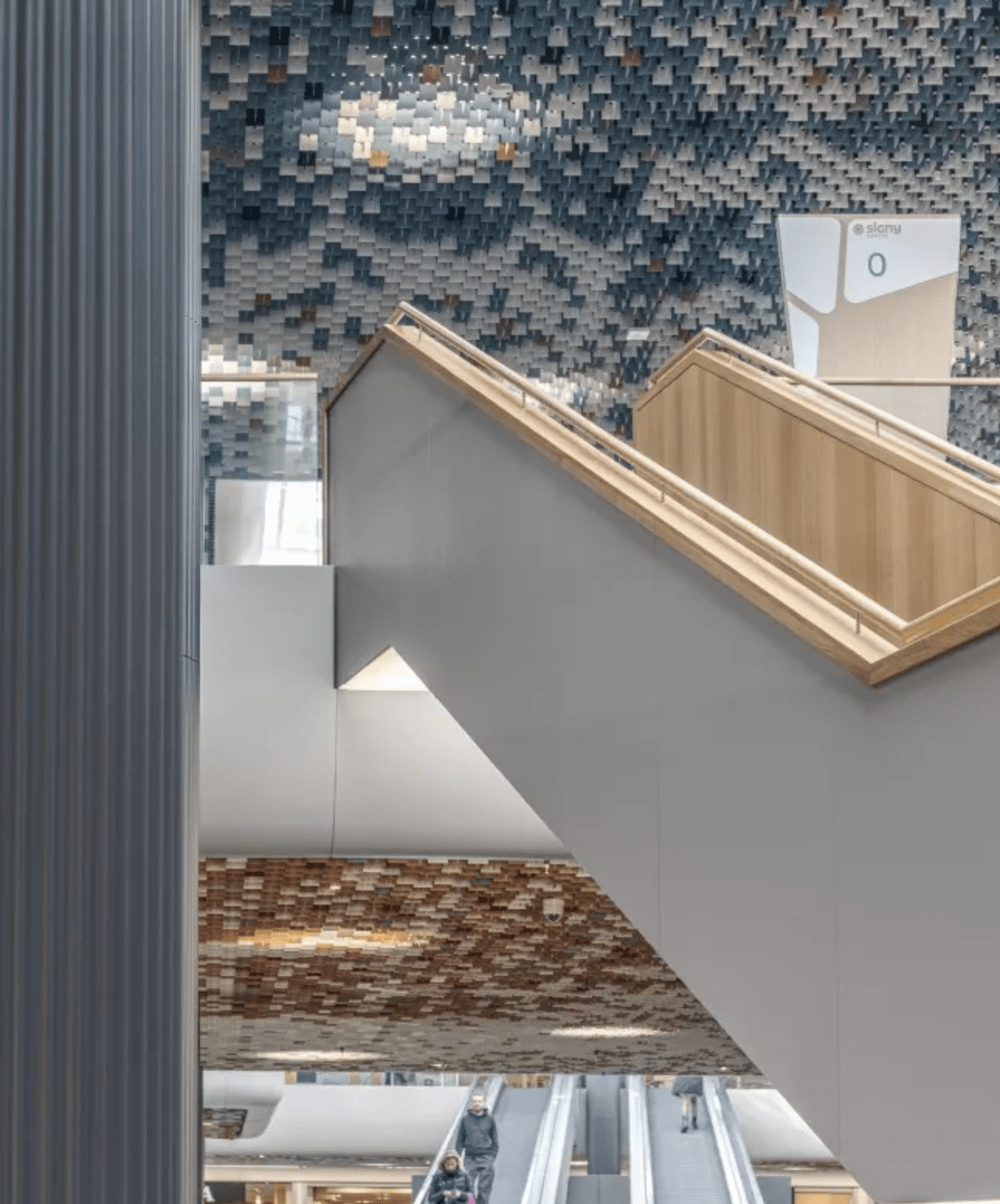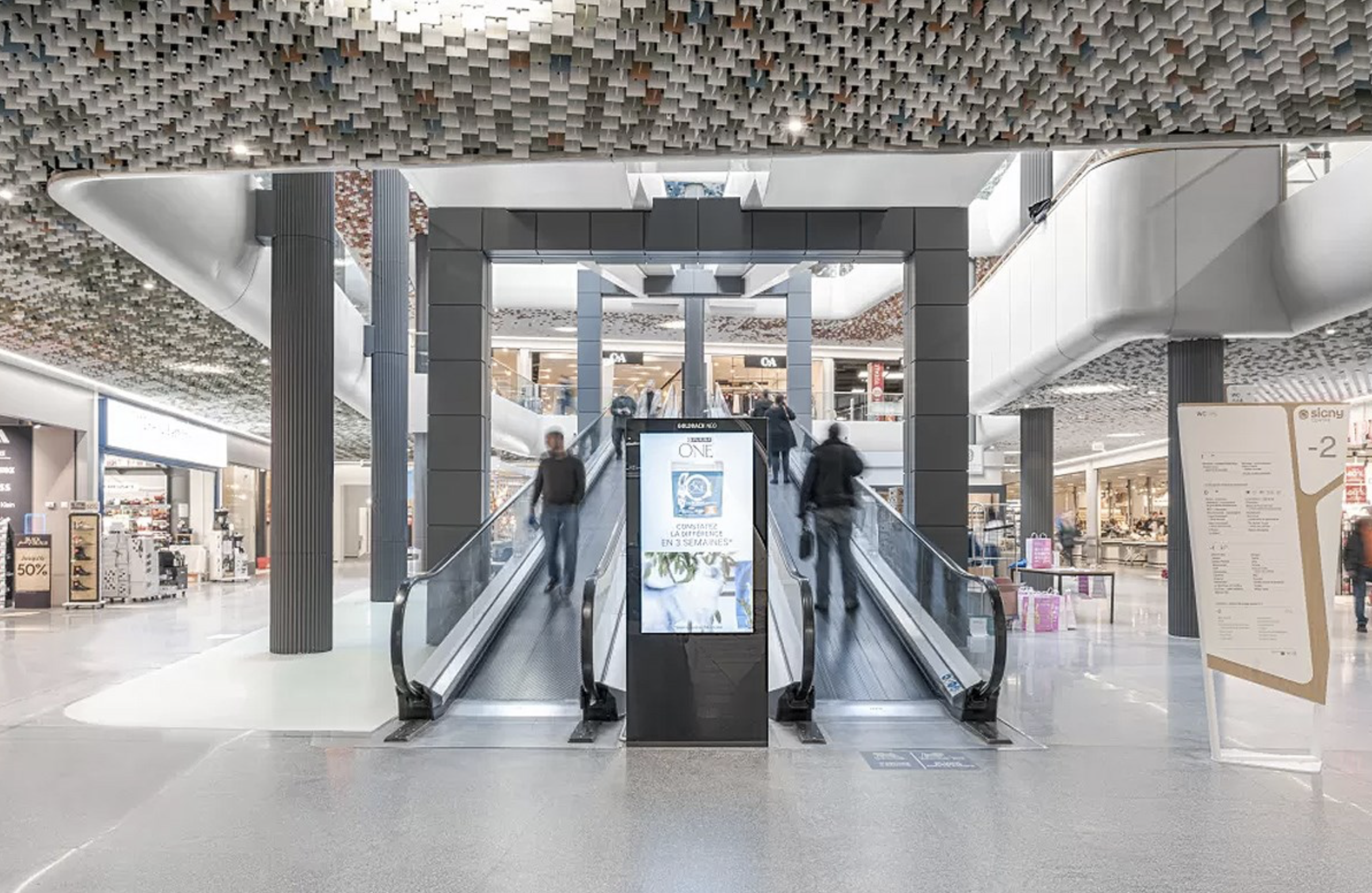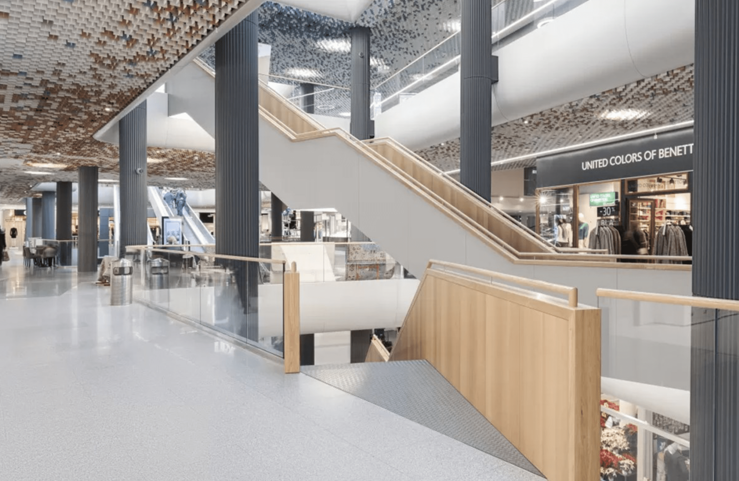 A bemutatott munkán jól látható, hogy játszottak a színekkel, ezt mindegy kihasználták, az alkalmazott felület tónusos lett, mely sugározhatja a bevásárló központ arculatát. Vagy akár a szinten elhelyezett üzletek jellegét. Minden esetre ez a lehetőség tág teret ad a fantáziának!