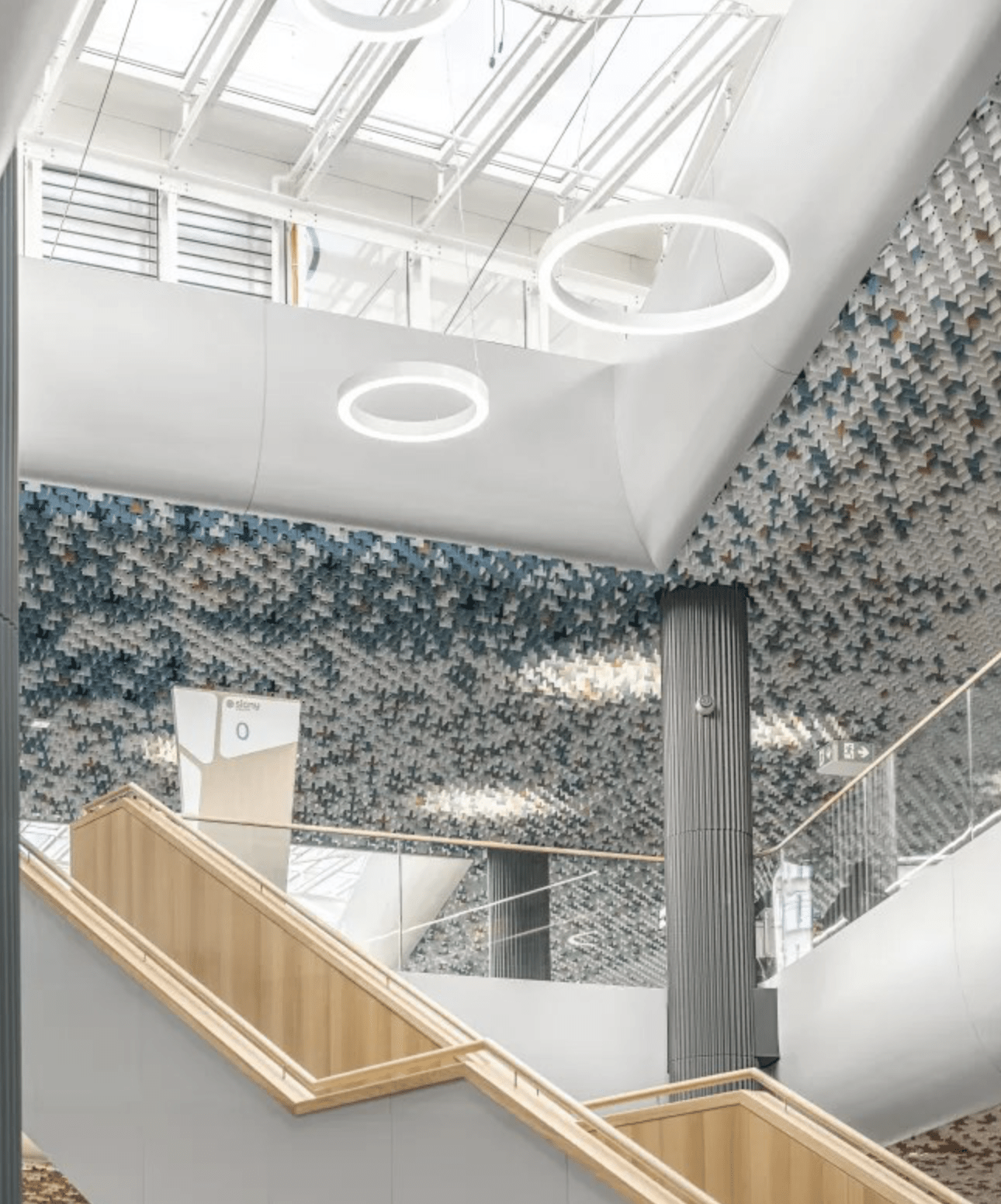 A bemutatott álmennyezetnél még lehetőség, hogy a lámpatestek is az álmennyezet feletti térben kapjanak helyet, a fotókon erre utaló jel is észrevehető. Random helyeken elhelyeztek lámpatesteket, ki emelve területeket, vagy csak a mennyezeti összkép megtörésére, hogy még több látni való, felfedezni való legyen.